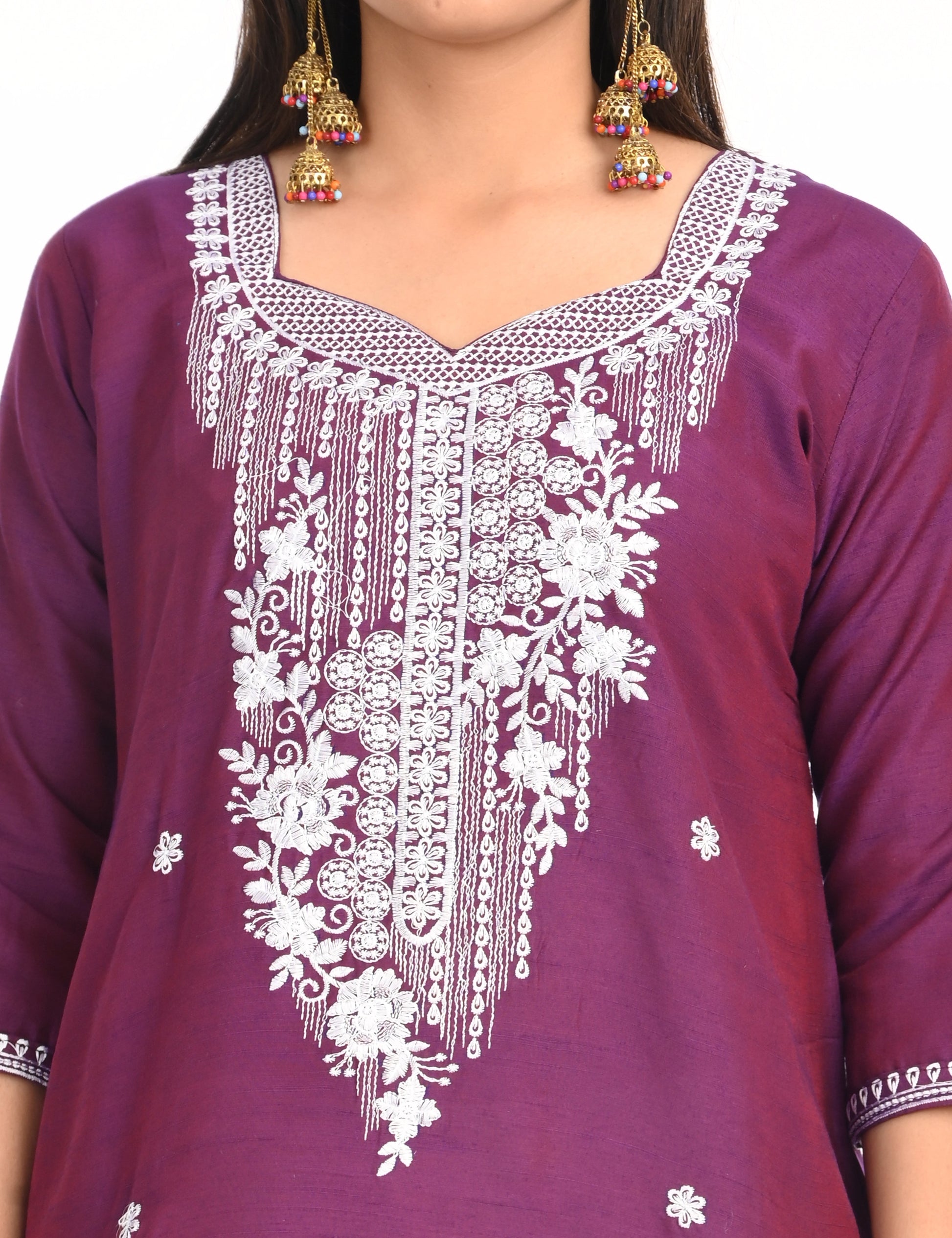 The kurti is adorned with subtle, intricate embroidery that adds a touch of grace and refinement. The small embroidery patterns are thoughtfully placed, creating a harmonious balance that enhances the overall design without overwhelming its simplicity. This design approach makes it versatile, suitable for festive gatherings, casual outings, or even formal office wear.