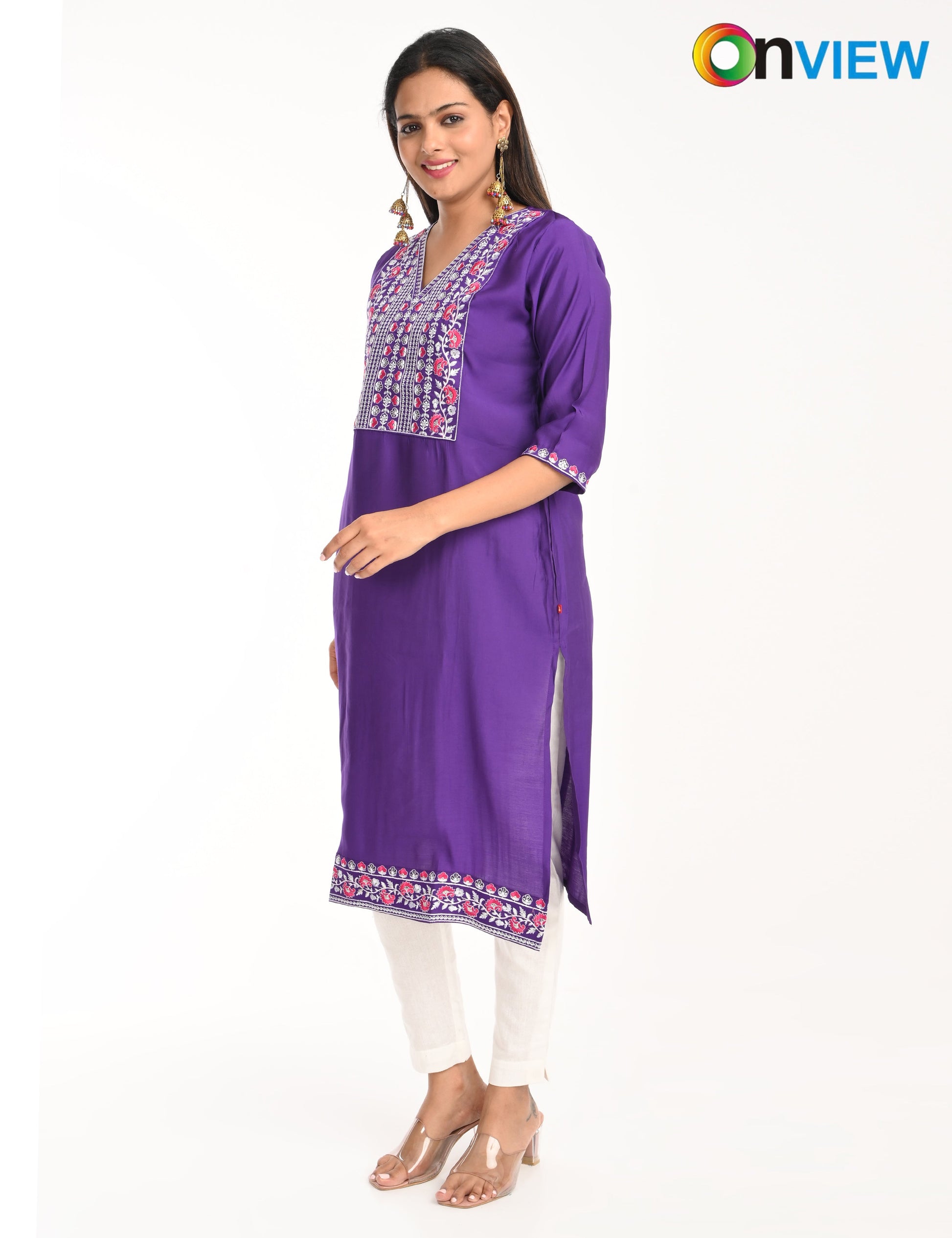 The ONVIEW ROMAN SILK EMBROIDERY WITH BORDER is a sophisticated blend of luxurious fabric and delicate craftsmanship, designed to elevate your style effortlessly. Made from premium-quality silk, this kurti boasts a rich texture and an elegant sheen that exudes opulence, making it a perfect choice for special occasions or everyday elegance.